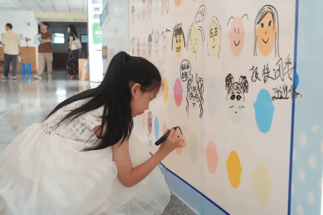 墻面之上,色彩明麗的笑臉輪廓靜靜佇立,似一張張待填色的青春畫布。從晨光微熹到暮色浸染,新生們三三兩兩駐足,執起畫筆,將初入校園的好奇、對未來的期許,細細描摹進輪廓里。有的寥寥幾筆,勾勒出澄澈的笑眼;有的巧思點綴,為笑臉添上星星發飾、小太陽耳墜。