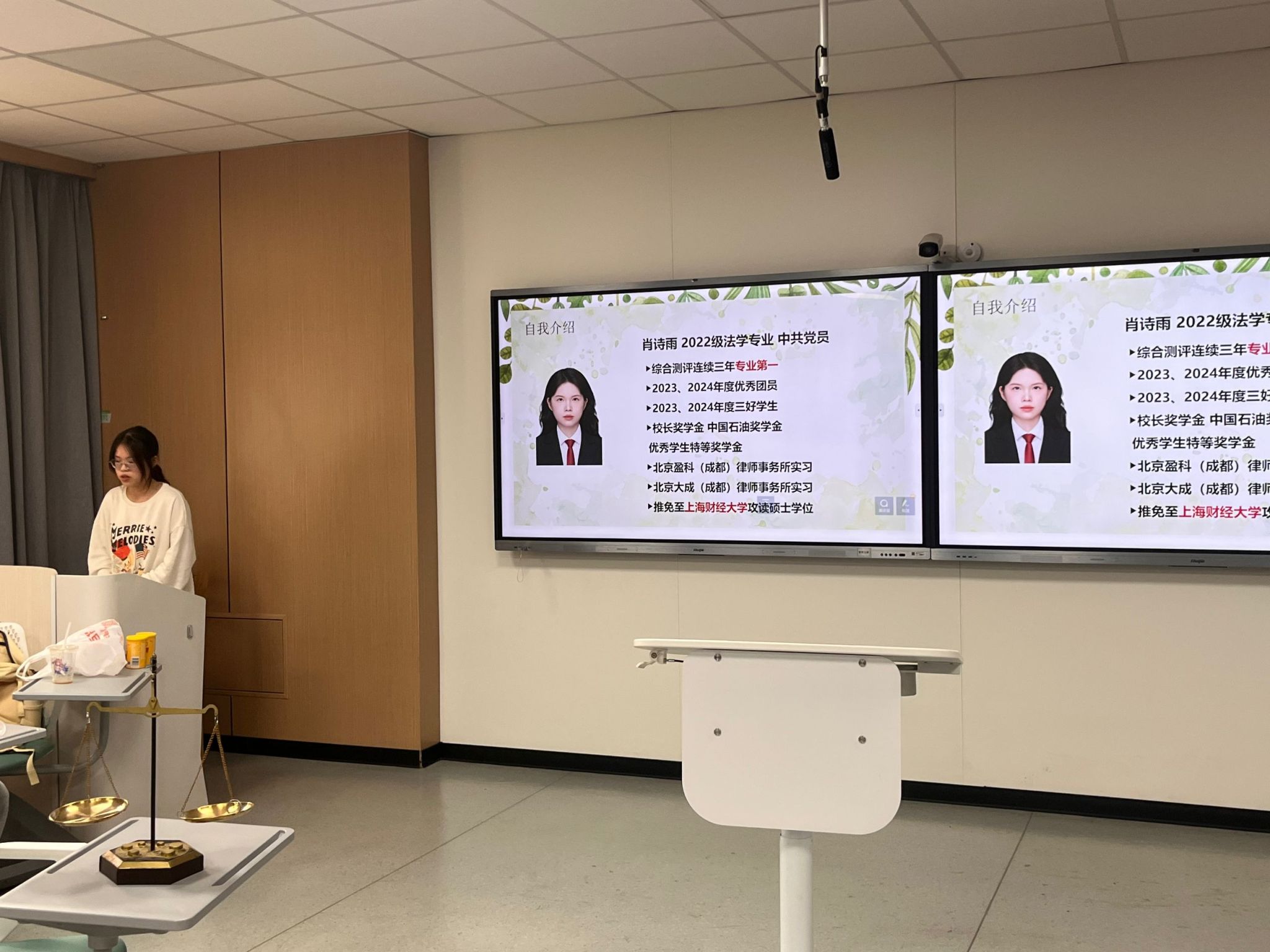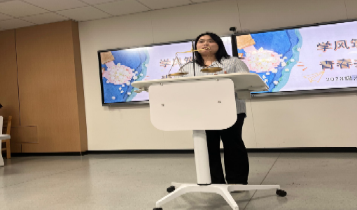 隨后,本次活動特別邀請到2022 級法學(xué)專業(yè)優(yōu)秀學(xué)姐肖詩雨分享經(jīng)驗。作為連續(xù)三年綜測第一,肖詩雨結(jié)合自身經(jīng)歷,為學(xué)弟學(xué)妹們梳理了法學(xué)專業(yè)的多元發(fā)展路徑。她詳細(xì)解讀保研、留學(xué)、考公、法考、考研與就業(yè)的準(zhǔn)備要點。她以 “別想,想的話全是問題;去做,做的話全是答案”鼓勵同學(xué)們主動探索,在實踐中找準(zhǔn)自我定位。