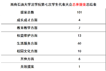 為積極響應西南石油大學第七次學生代表大會提案工作,更好構建交流溝通渠道,法學院學生會權益維護部匯總了各類提案,經過層層篩選,將同學們的心聲送至校權益維護部,并在10月21日圓滿結束任務。