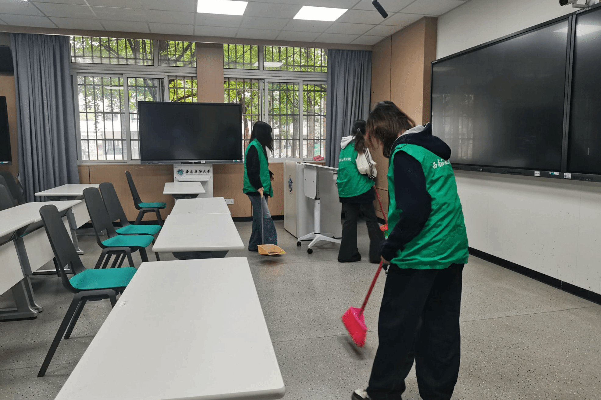 “小法柚”志愿者在教室內(nèi)清掃垃圾