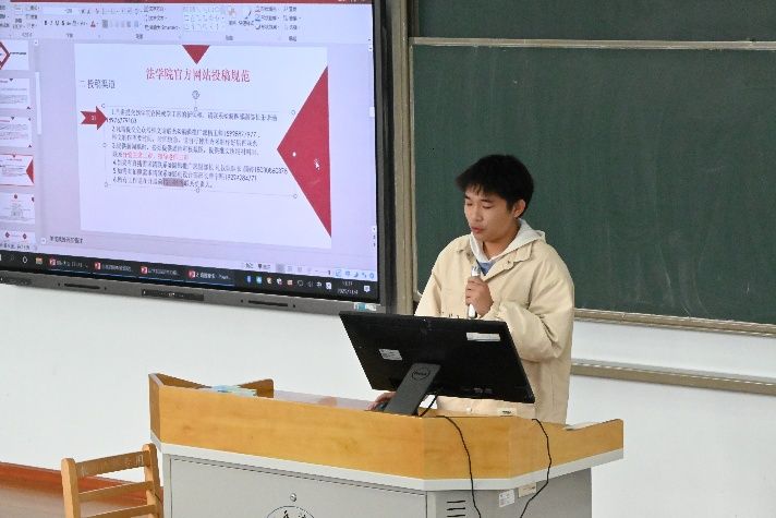 會議伊始,法學院團委副書記(學生)彭麗穎講話。她在發言中強調了學生骨干的作用,希望各部門同學作為學生干部,要牢記使命、錘煉本領、兼顧學業,努力成為全面發展的表率。