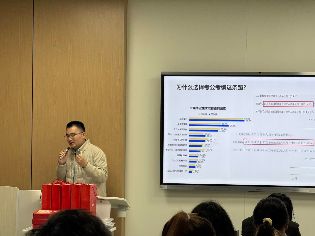 本次講座圍繞2026年四川省省考與選調(diào)的解讀展開(kāi),主講教師史黔是金標(biāo)尺資深講師,他憑借多年的教育經(jīng)驗(yàn)為同學(xué)們解讀了相關(guān)政策并分享了備考策略。講座中,史老師從公告解讀、發(fā)展前景分析和筆試備考建議等角度對(duì)省考和選調(diào)進(jìn)行了深入分析解決,他提到競(jìng)爭(zhēng)比較激烈,選拔標(biāo)準(zhǔn)較嚴(yán)格。不僅要求考生具備扎實(shí)的專業(yè)知識(shí)和技能,還注重考察其綜合素質(zhì)和社會(huì)責(zé)任感。講座最后設(shè)置了問(wèn)答環(huán)節(jié),史老師仔細(xì)耐心答復(fù)了同學(xué)們的問(wèn)題,幫助同學(xué)們更加清晰了解相關(guān)政策。