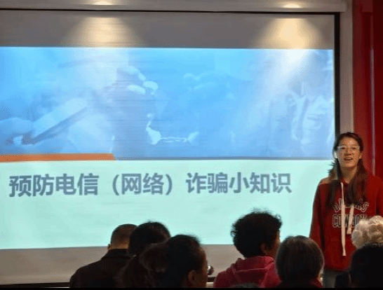 活動伊始,兩名同學彈奏樂器,其他同學伴唱《蘭亭序》。隨后,團支書圍繞“用心守護,用愛反詐”主題,從電信詐騙的定義、常見形式、識別防范及補救措施四方面展開宣講。在講解常見詐騙形式時,同學們表演了情景劇,結合“投資養老”“冒充公檢法”等案例,生動揭露詐騙手法,并強調保護個人信息、做到“不輕信、不透露、不轉賬”。團支書總結“防詐三招”:警惕高回報投資、核實對方身份、遇轉賬要求先冷靜;并介紹“補救兩步法”:立即聯系銀行掛失,保存證據并報警。這些方法受到老人們的一致好評,認為“記得住、用得上”。