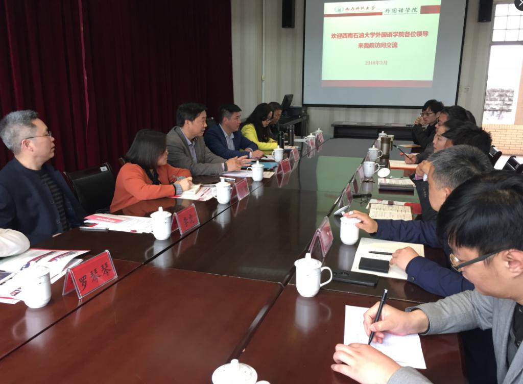為學習了解西南科技大學外國語學院的優秀辦學經驗,提高我院教學、科研及管理水平,我院全體黨政領導班子及油氣資源區語言文化研究中心負責人于3月21日上午到西南科技大學外國語學院訪問,就專業建設、師資隊伍建設、行政管理、學生工作、科學研究和研究生培養等事宜進行了調研交流。