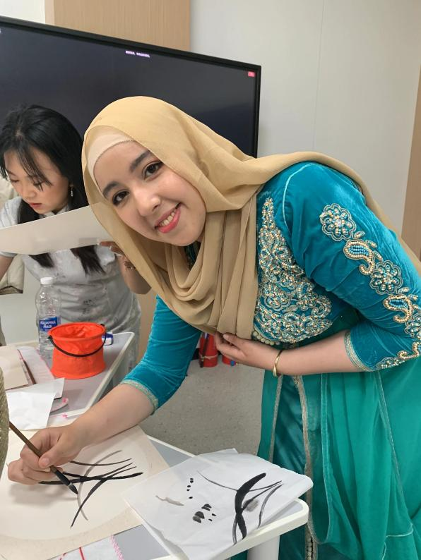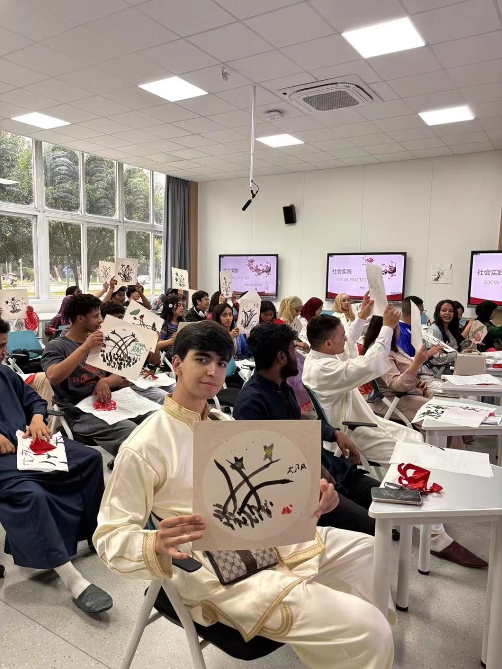 在中國書法體驗活動中,兩位擅長軟筆書法的助教同學現場進行書法示范,展示正確的執筆姿勢、書寫方法,國際學生們積極嘗試用毛筆書寫自己的名字、國家名等。
