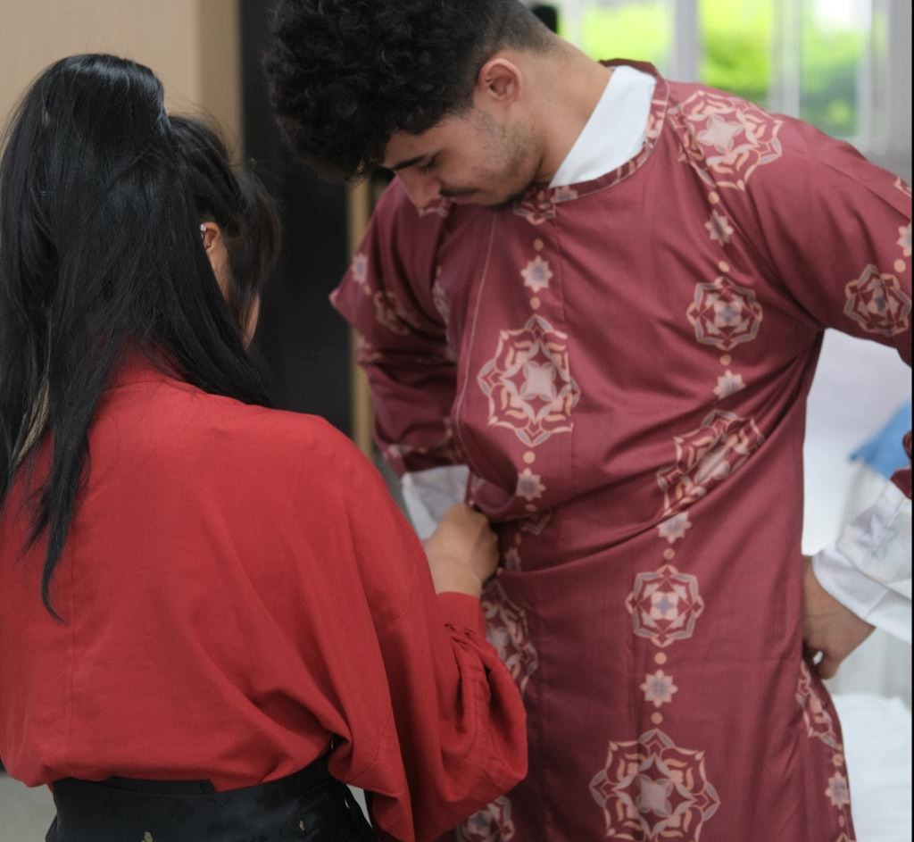 在漢服體驗活動中,彭敏老師向同學們介紹了不同朝代漢服的形制、禮儀等,留學生們爭先恐后地試穿,之后彭老師邀請身著各民族傳統服飾的留學生參與到展示環節,身著漢服與其他各國家民族傳統服飾的國際學生們以教室為舞臺,大方地“走秀”展示,而在座的留學生們則自發地唱起歌來進行配合,整個活動現場進入高潮,在場的所有人都體驗了一場情緒高昂的視覺、聽覺盛宴。
