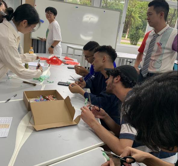 本次活動采用“面對面”的教學方式,由助教進行現場指導,讓國際學生深入體驗、學習中國文化。94位國際學生被分為8個小組,在三個教室中輪流“打卡”體驗中國書法、國畫、漢服、非遺絨花、剪紙共五個中國傳統文化項目。活動開始前,經任課老師的介紹指引,負責各文化項目的助教分別向留學生展示了不同文化項目的背景知識與基本操作方法,引起了留學生迫不及待、躍躍欲試的興趣。
