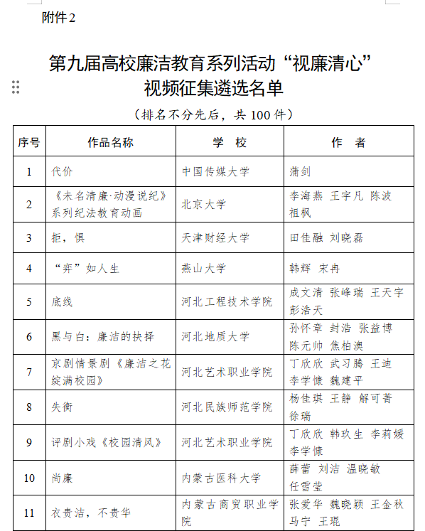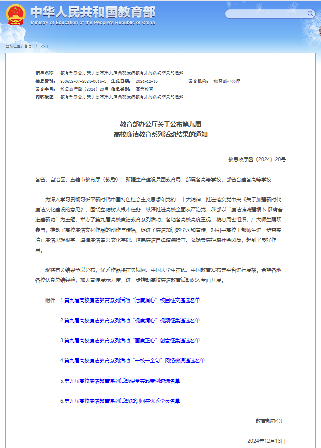 近日,教育部第九屆高校廉潔教育系列活動“視廉清心”視頻征集遴選結果正式公布,我院作品《傳承》成功入選,充分展現了學院在學生思想政治教育和廉潔文化建設方面所取得的顯著成效。