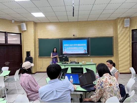 2025年5月22日下午,外國語學院在思學樓B106成功舉辦首次“AI教學創新工作坊”。本次活動以《石油科技俄語》、《俄語修辭學》、《學術寫作》三門AI智慧課程建設為依托,旨在推動數智化教學理念與實踐深度融合,探索混合式教學創新模式。學院副院長陳婧、三門AI課程負責人及課程組教師全程參與,智慧樹金課咨詢團隊受邀進行專題培訓。工作坊圍繞“政策解讀、工具應用、創新討論”三大核心環節展開。