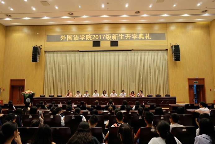 金秋送爽,丹桂飄香。9月13日下午,學院在圖書館學術報告廳隆重召開了2017級新生開學典禮。學院院長孫陽,學院黨委方可書記,副院長龍仕文,外國語學院院長助理廖穎,教學辦公室主任肖燕姣,研究生英語教研室主任呂旭英,俄語教研室主任楊麗新,英語外教代表Ellie Dearing,團委負責人夏蕾老師,新生輔導員羅文雙老師,英語、俄語教研室老師代表以及244名新生參加大會。大會由黨委副書記孫德剛主持。