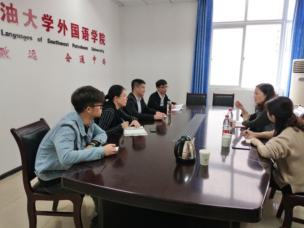 11月14日下午,西南石油大學(xué)團(tuán)委書記夏艷一行來(lái)到外國(guó)語(yǔ)學(xué)院調(diào)研指導(dǎo)分團(tuán)委工作;外國(guó)語(yǔ)學(xué)院黨委副書記孫德剛,輔導(dǎo)員夏蕾等在外國(guó)語(yǔ)學(xué)院會(huì)議室接待了夏艷書記一行。雙方就學(xué)生“第二課堂”和“第三課堂”學(xué)分修讀等情況進(jìn)行了座談交流。