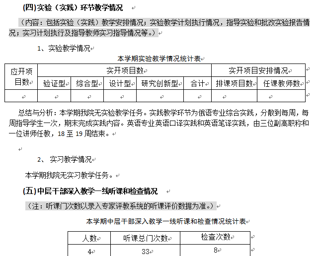 總結與分析:本年度我院處級領導干部繼續(xù)深入課堂聽課,全年聽課人均8次以上,聽課總門數(shù)22門。課型包括全校公選的大學英語、英語、俄語的專業(yè)課,以及新近教師課堂情況。聽完課后及時與任課教師溝通反饋,給教師們提出了許多寶貴的意見。同時在第一周和第六周我院處級領導干部都進行了教學檢查,情況良好。