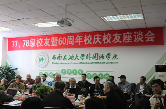 2018年10月31日下午,西南石油大學英語77、78級校友暨60周年校慶校友座談會在思學樓AB406會議室隆重舉行,旨在加強校友聯系,溝通校友感情,聽取校友意見,促進學院發展。學院黨委書記杜宗良,黨委副書記孫德剛,學院副院長李虎出席了本次座談會,多位退休老教師以及20余位英語77、78級校友代表參加了此次活動。座談會由外國語學院主持工作副院長呂旭英主持。