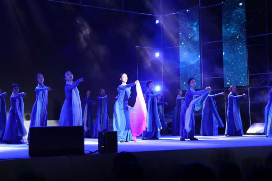 “我不知道風(fēng)在往哪一個方向吹,我知道是夢里的光輝”。青春是什么,青春就是為夢想奮斗,一路奔跑,青春就是全力以赴,盡情地在舞臺綻放。精彩絕倫的舞步,窈窕婀娜的體態(tài)!舞動青春,舞動活力;追夢青春,追夢未來!我院舞蹈以徐志摩的一首抒情詩為旁白開場,讓人一下墜入一種“夢”的情境之中,撥人心弦。演員的服飾皆為深藍(lán)色調(diào),給人一種朦朧又渴望的感覺。舞動的絲巾與搖曳的裙擺,把線條的美感與外院女孩的柔美展現(xiàn)的淋漓盡致。絲巾一次又一次的浮動,展現(xiàn)的是青年人們對夢的追逐、渴求、執(zhí)著與不懈。