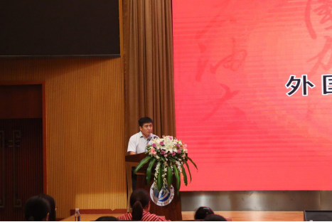 副院長(主持工作)呂旭英全程使用英文表達了對2019級新生的美好祝愿,她囑咐同學們語言學習沒有捷徑,必須踏踏實實練習“聽”“說”“讀”“寫”“譯”五種能力,樹立明確的學習目標,從一點一滴做起。胥瑾老師鼓勵新生要滿懷熱情,堅定信念,學好專業知識,以飽滿的姿態迎接大學生活。外籍教師Dean Horton以幽默風趣的口吻熱烈歡迎新同學的到來,他通過一系列英文大賽、校園的美麗風景以及便捷的交通激發起了同學們對大學生活的興趣。會上,2019級研究生代表朱珠和本科生代表徐曉然分別進行發言,談到大學與中學生活的種種不同,并對即將迎來的大學生活滿懷期待。