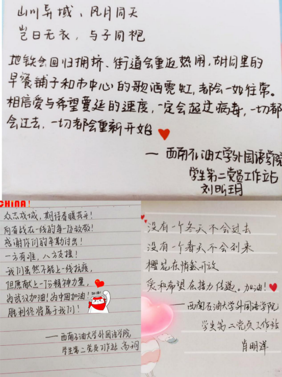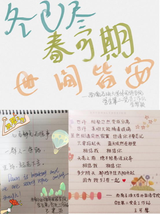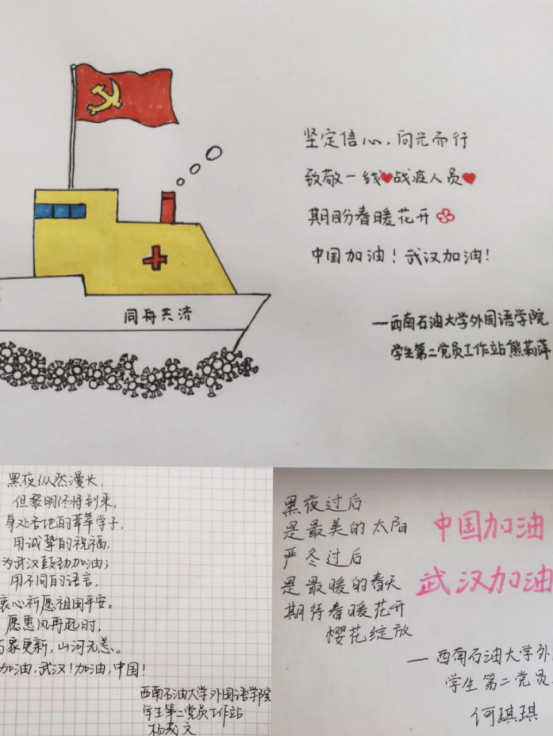 疫情當下,作為新時代的大學生,雖無法直接投入此次戰役,但為了踐行初心使命,履行黨員義務,在做好防疫工作的同時,外國語學院學生公寓第二黨員工作站積極開展線上手寫祝福活動,用筆尖芳華致敬奮斗在一線的醫護人員,用深切字句為武漢同胞加油。
