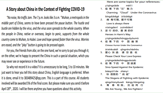 韋麗莉老師結(jié)合時事精心策劃在線教學(xué)活動,在其漢語課程教學(xué)班發(fā)起了“講述抗擊新冠肺炎病毒期間中國故事”的活動,鼓勵國際學(xué)生參考“疫情下的中國速度”、“疫情下的中國幽默”、“疫情下的云魅力”、“病毒可隔,愛不可隔”、“逆行的你,最美的你”、“愛心快遞:請您查收”、“標(biāo)語里的戰(zhàn)疫”、“青春有我,抗疫同行”等主題錄制五至十分鐘的視頻講述中國抗疫故事,參與學(xué)生需在4月28日前將視頻發(fā)送至老師郵箱,可作為成績加分項,以此增進國際學(xué)生對中國抗疫的理解、認(rèn)同和擁護。
