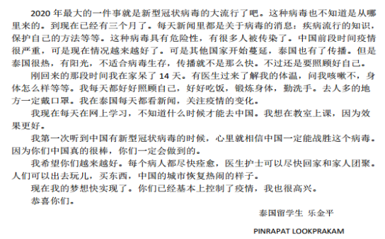 (圖為泰國學(xué)生樂金平撰寫的小短文)