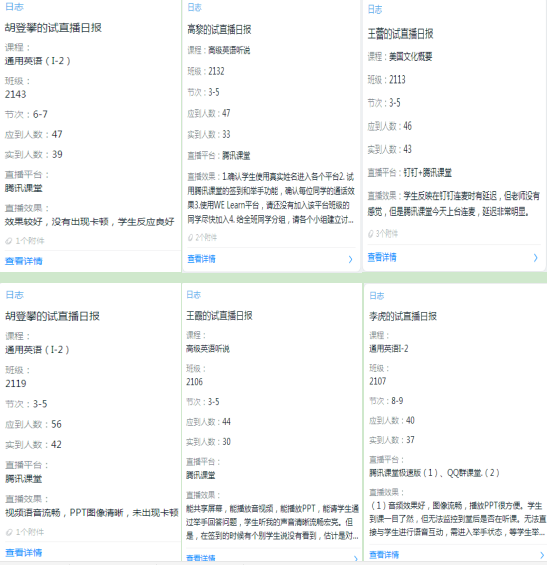 通過釘釘試直播日報的學(xué)生應(yīng)到、實到人數(shù)對比分析,發(fā)現(xiàn)試播中學(xué)生上線率不夠理想,經(jīng)調(diào)研,雖然臨近開課但仍有小部分學(xué)生未加入課程聯(lián)系QQ群。學(xué)院教學(xué)辦立即聯(lián)合大學(xué)英語兩個教研室按教學(xué)班清理還未入群的學(xué)生名單,由教學(xué)辦統(tǒng)一匯總后點對點反饋到學(xué)生所在學(xué)院請其幫助督促相關(guān)學(xué)生盡快入群。第四周大學(xué)英語系列課程的學(xué)生線上出勤率達到99%左右。此外,釘釘日報還可以協(xié)助學(xué)院挖掘線上教學(xué)能手,日報顯示胡登攀老師多次試直播的效果良好,學(xué)院教指委云督導(dǎo)后同樣反饋“胡老師的線上教學(xué)很好很流暢,課程設(shè)計、節(jié)奏把控、氛圍帶動、細(xì)節(jié)處理都恰到好處,推薦大家學(xué)習(xí)”。
