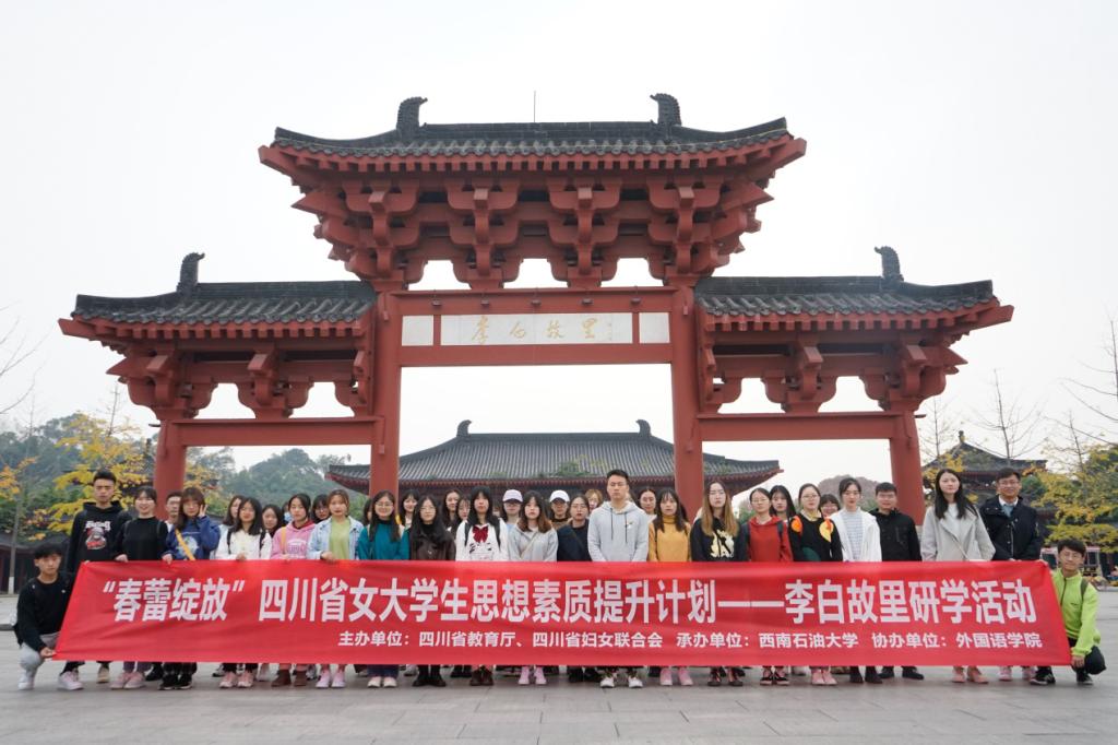 2020年11月,外國語學院組織學生赴江油市“李白故里”開展研學活動。此次活動作為“春蕾綻放”四川省女大學生思想引領系列活動之一,由四川省婦女聯合會、四川省教育廳、四川省互聯網信息辦公室主辦,西南石油大學承辦,外國語學院協辦。此次活動通過了解李白生平故事,領悟古人智慧,體驗和學習古典詩詞文化,以此來提升大學生思想素質。