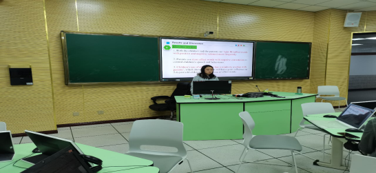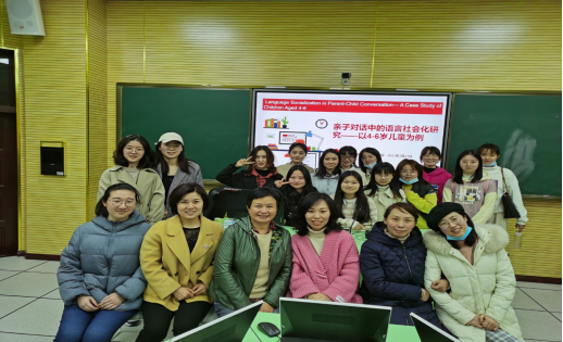研討會于晚上七點準時開始。首先是李老師簡單介紹了出席的各位指導老師。接著,本次研討會的匯報人陳鶴丹和張雪英兩位同學分別對自己的論文《親子交流中的語言社會化研究-以4-6歲兒童為例》和《5-6歲兒童情感語言社會化研究》的情況進行了介紹,并就自己在論文寫作過程中遇到的問題與參會的老師和同學們進行了充分的討論。