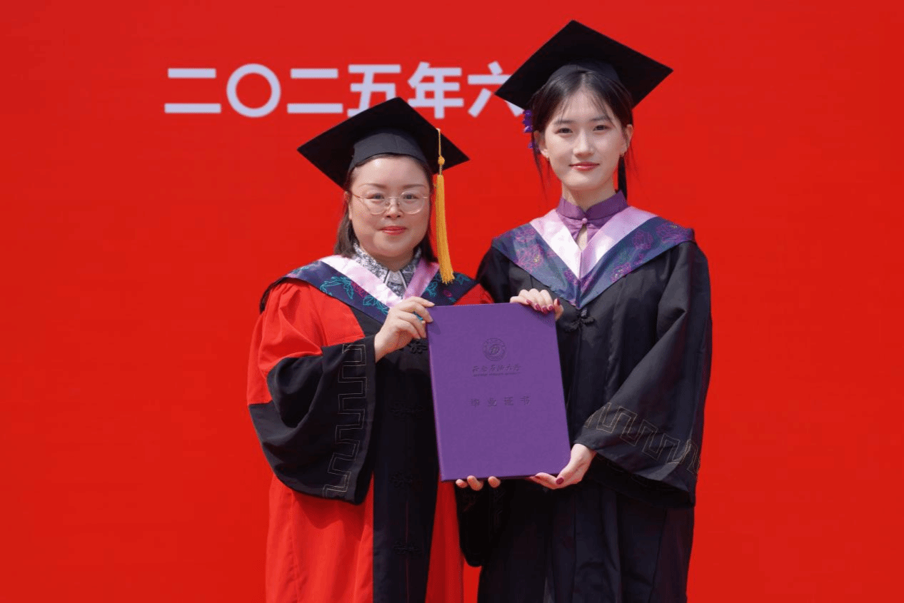隨后,姚明淑和呂旭英逐一為畢業生們撥穗正冠,頒發畢業證書和學位證書,并與每位同學親切握手、合影留念。現場溫情涌動,畢業生們臉上滿溢著幸福的笑容,眼眸中閃爍著對未來的憧憬光芒。
