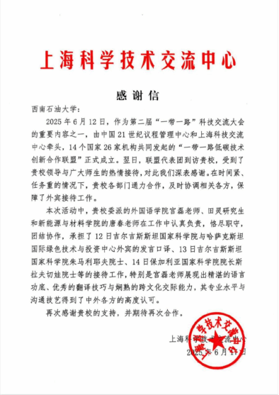 2025年6月12日,第二屆“一帶一路”科技交流大會上,由科技部指導,中國21世紀議程管理中心和上海科技交流中心牽頭,我校與14個國家25家機構聯合發起的“一帶一路”低碳技術創新合作聯盟正式宣告成立。該聯盟是我校首個國家級國際聯盟,各級領導高度重視,相關部門通力協作,全力保障并圓滿完成了包括合作交流、禮賓接待、語言服務等具體工作在內的各項任務。以俄語專業教師宮磊、首屆俄語筆譯碩士研究生田靈為代表的我院師生,在本次活動中承擔了文稿筆譯、會議交傳及外賓陪同等具體工作,憑借深厚的語言功底、嫻熟的翻譯技巧與精湛的跨文化交際能力,獲得了中外與會各方的一致認可,上海科學技術交流中心為此專門向我校致信感謝。