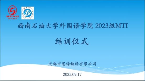 2025年9月17日上午,西南石油大學外國語學院2023級MTI“思譯特色實訓”結訓儀式通過騰訊會議線上平臺順利舉行。外國語學院院長呂旭英教授、研究生專業實踐負責老師黃元清,成都市思譯翻譯有限公司董事長章上游、總經理黃昌佑、副總經理黃萬印、副總經理姜道國、培訓總監郭霽明,總經理助理彭麗,以及全體參訓學員共同參加了本次線上儀式。