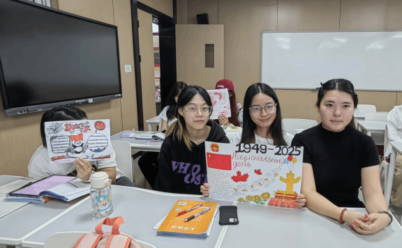 同學們圍繞“團圓”與“愛國”核心主題,將中俄文化元素巧妙融合。板報中,彩筆勾勒的圓月與長城相映成趣,俄語書寫的“С праздником середины осени!”(中秋節(jié)快樂)與“С национальным днем!”(國慶節(jié)快樂)祝福語醒目工整,更穿插“Лунный пирог“(月餅)、“государственный флаг ”(國旗)等雙語詞匯注解。從版面設計到內容編排,學生們分工協(xié)作,用細膩筆觸詮釋“家國團圓”的美好寓意。