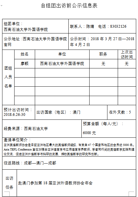 應(yīng)亞洲外語教師協(xié)會邀請,我院教師廖穎擬于2018年6月27日-29日赴澳門參加第18屆亞洲外語教師協(xié)會年會論文交流。亞洲英語教師協(xié)會是目前亞洲地區(qū)最大的英語教師組織,有來自47個國家和地區(qū)的會員近5000名。Asia TEFL Conference旨在加強全亞洲語言學(xué)與應(yīng)用語言學(xué)界教師、學(xué)者同行間的英語教學(xué)實踐和理論交流,促進亞洲外語教學(xué)與科研的發(fā)展,推動英語教學(xué)的研究和創(chuàng)新。本次出訪有利于提高教師科研水平,促進我院學(xué)科建設(shè)。經(jīng)研究,我院同意該教師屆時出訪,在外時間5天,出訪費用教師自費與學(xué)院支持相結(jié)合。