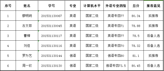 根據(jù)《西南石油大學(xué)關(guān)于在2019屆本科畢業(yè)生中推薦免試研究生的通知》和《外國語學(xué)院2019屆本科畢業(yè)生推薦免試碩士研究生實(shí)施辦法》,經(jīng)過學(xué)生本人申請、審查申報材料、組織專業(yè)面試等環(huán)節(jié)。按照總分(績點(diǎn)+面試+特長)從高到低的順序,確定2015級英語專業(yè)廖明玥、古文菲,2015級俄語專業(yè)羅為藝為外國語學(xué)院2019屆本科畢業(yè)生免試研究生推薦人員;確定2015級英語專業(yè)曹柳、劉佳,2015級俄語專業(yè)周一欽為遞補(bǔ)后備人選。