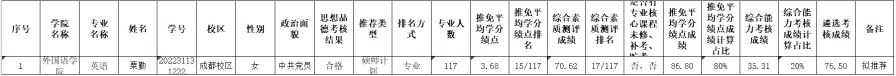 由于兩位同學放棄碩師計劃名額,根據學校相關政策規定,現順延至遴選考核成績排名下一位的同學。按照2026屆本科畢業生推薦免試碩師計劃相關規定,通過對學生思想道德考核、學分績點、綜合能力考核答辯,最終形成我院2026屆本科畢業生推薦免試碩師計劃擬推薦名單(英語專業擬推薦1名:粟勤),現予以公示,并通知如下: