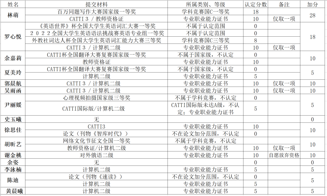 根據(jù)《西南石油大學推薦優(yōu)秀應屆本科畢業(yè)生免試攻讀研究生工作管理辦法》(西南石大委發(fā)[2020]54號)、《西南石油大學關于在2023屆應屆本科畢業(yè)生中推薦免試研究生的通知》(西南石大教[2022]40號)和《外國語學院推薦優(yōu)秀應屆本科畢業(yè)生免試攻讀研究生管理細則》,經(jīng)學生報名申請,學院專家審核小組對其科研成果、學科競賽獲獎、專業(yè)職業(yè)能力證書等綜合能力進行了審查答辯,審查結果如下: