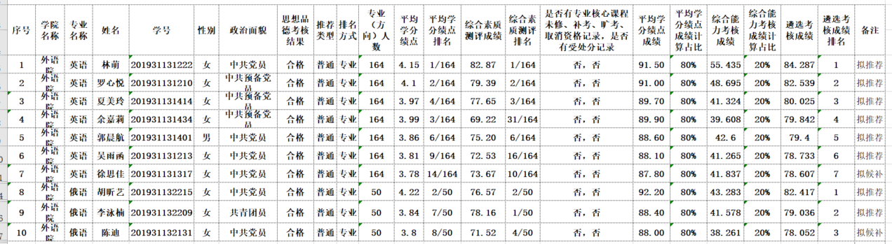 按照我院2023屆本科畢業(yè)生推薦免試攻讀碩士研究生相關(guān)規(guī)定,經(jīng)學(xué)生自愿申請,通過對學(xué)生思想道德考核、學(xué)分績點(diǎn)、綜合能力考核答辯,最終形成我院2023屆本科畢業(yè)生推薦免試攻讀碩士研究生擬推薦名單(英語專業(yè)擬推薦6名:林萌、羅心悅、夏美玲、余嘉莉、郭晨航、吳雨函,擬候補(bǔ)1名:徐思佳;俄語專業(yè)擬推薦2名:胡昕藝、李泳楠,擬候補(bǔ)1名:陳迪),現(xiàn)予以公示,并通知如下: