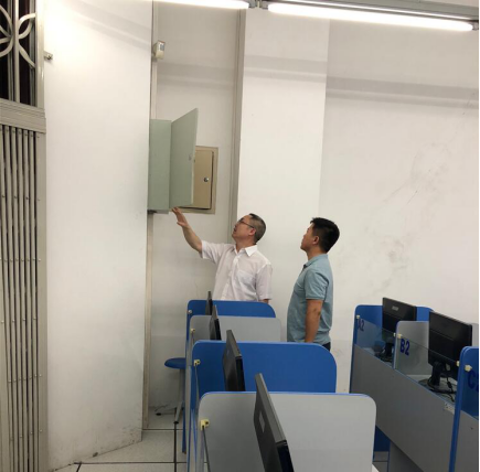 實驗室負責人陳波對安全用電巡檢工作做了任務分配,實驗室技術人員對各自負責的語音教室電路電器設備進行了認真排查,對線路老化的插線板和配電箱進行及時更換和整改。李虎副院長在陳波的陪同下對每個語音教室進行了仔細檢查,檢查中發現部分教室的電源控制箱存在絕緣處理不到位可能導致觸電的安全隱患,要求實驗室立即整改。