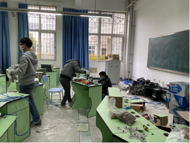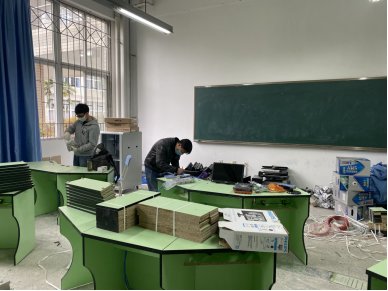 3月9日,承建方四川奧爾博睿信息技術有限公司正式開始施工,施工人員按照要求全程佩戴口罩作業,準備了消毒酒精和消毒噴灑設備,作業前先進行教室消毒和人員消毒,并且制定了承諾書、疫情防控措施、項目人員體溫登記表、教室消毒表并粘貼在墻上,每天按時登記更新。