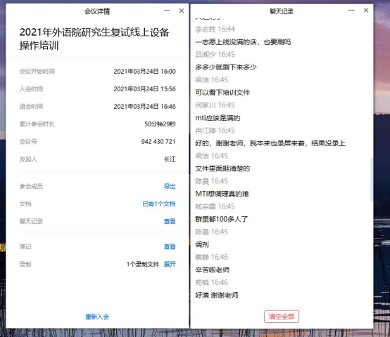 本次操作培訓及時地解決了考生網絡復試的設備準備工作及相關要求,同時解決了考生的各種疑問和遇到的問題,有力的保障了外國語學院2021年碩士研究生線上遠程復試工作的順利進行。