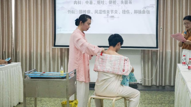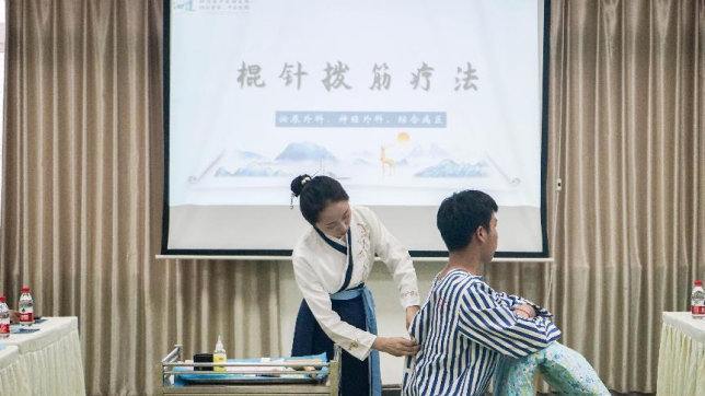 專業診療及護理團隊在現場進行中醫診療演示。火熨術、棍針撥筋療法、杵針療法、火龍罐、砭石刮痧、溫通刮痧六種中醫診療方式一一呈現在大家眼前,讓人直觀感受到了中醫診療“以外治內,痛舒合一”的獨特魅力。觀看演示的國際學生感到非常新鮮,有的拿起手機記錄治療過程。