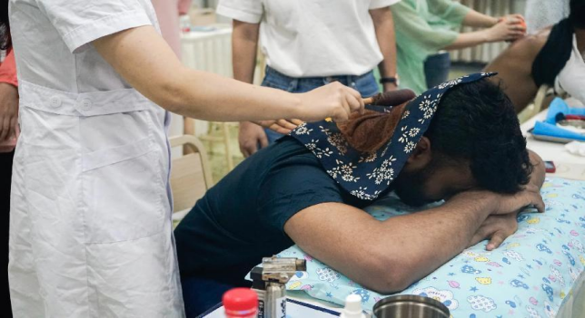 隨后,來自斯里蘭卡的Ravindi、孟加拉國的Zobair Hossain Ahammad、摩洛哥的Nadia El kabous、贊比亞的Chatontolamirriam、巴基斯坦的Daim Safeer Mughal等國際學生沉浸式地體驗了火龍罐、棍針、溫通刮痧等特色中醫療法,每個人都很享受這個治療過程,來自印度的Raza興奮地比起了V字手勢,表示很滿意。