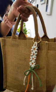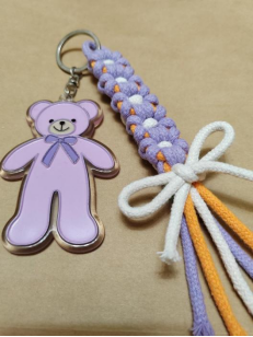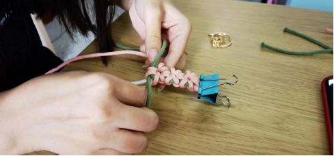 在職工小家的桌上,精心準備的各色彩繩、鑰匙扣整齊擺放,等著一雙雙巧手將它們化繭成蝶?;顒娱_始后,教職工們根據各自喜愛的配色選擇不同顏色的彩繩,開始認真學習繩結穿引的技巧,邊學邊動手,在動手的過程中逐漸熟能生巧。不久后,一個個粉色、黃色、紫色、白色的手工編織花鏈便制作完成了,異彩紛呈,競相爭艷。歡聲笑語中,大家將花鏈掛在包包上、手機上,隨時看到就能憶起在校手工協會度過的美好時光和追求生活情趣的積極態度。