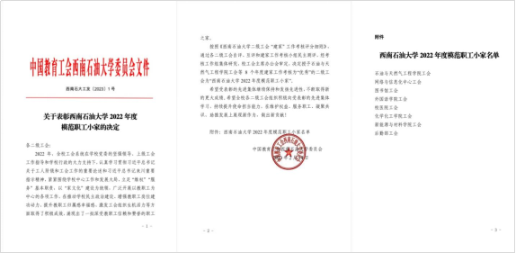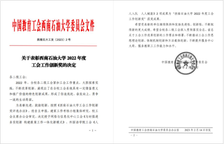 2023年2月14日,中國教育工會西南石油大學委員會辦公室印發表彰決定,外國語學院工會獲評“西南石油大學2022年度模范職工小家”,外國語學院工會《人人入隊 人人賦能》成果獲評“西南石油大學2022年度工會工作創新獎”。