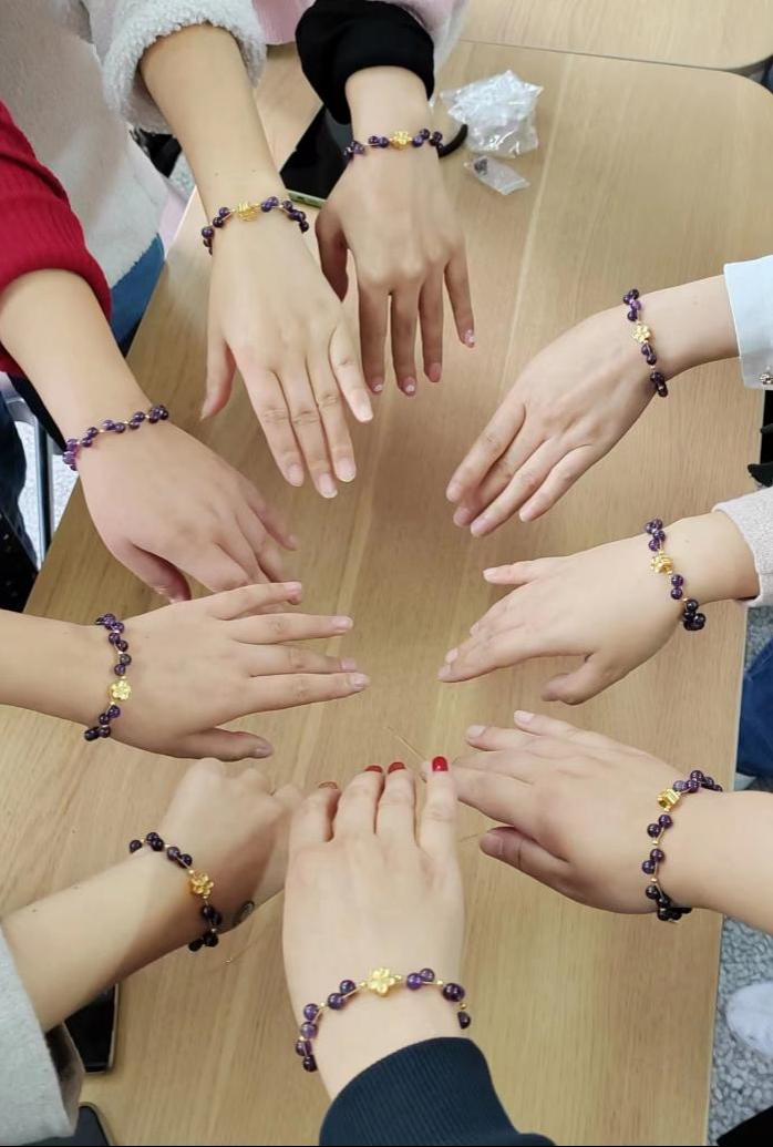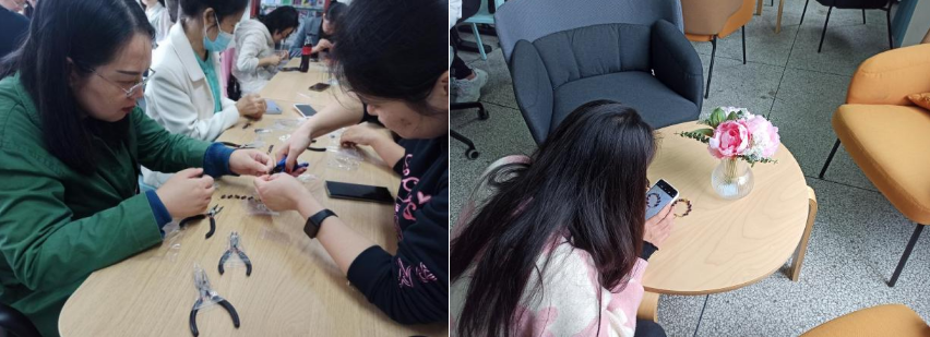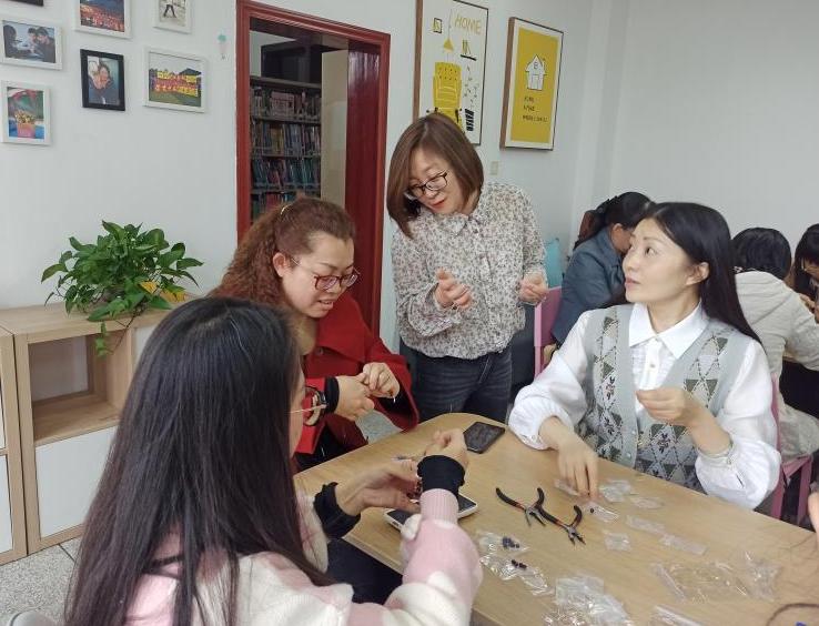 本期生活美學(xué)技能培訓(xùn)的主題為DIY手鏈,課程開始前主講老師將提前錄好的教學(xué)視頻發(fā)給各位參與培訓(xùn)的學(xué)員,讓大家提前了解DIY手鏈的制作過程。待大家拿到制作需要的工具和材料后,老師開始為大家逐一講解它們的作用。緊接著,老師讓學(xué)員們拿起各自面前的材料跟著她一起制作手鏈,遇到不會的步驟學(xué)員們舉手示意,張老師放慢動作耐心講解。經(jīng)過一小時的創(chuàng)作,慧心巧思的學(xué)員們都完成了各自的手鏈,大家的手鏈細(xì)節(jié)上有所不同,有些是單線串珠,有些是雙線串珠。制作完成后,學(xué)員們戴上手鏈互相交流欣賞,為美美的生活留下了美好的回憶。