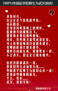 2020年初,一場突如其來的新冠疫情打破了我們正常的生活。疫情防控阻擊戰前,來自各地區的廣大醫務工作者、人民解放軍指戰員以及各方面人員發揚了越是艱險越向前的大無畏革命精神,聞令而動,“逆行”前往湖北和武漢支援。與此同時,全國各地堅持一方有難、八方支援,從不舍晝夜開工的火神山、雷神山醫院建設者,到身處各行各業、主動捐款捐物的普通人,疫情面前,全國各族人民都同湖北和武漢人民站在了一起,各盡所能,為疫情防控出一份力。新冠疫情牽動著億萬民眾的心,也牽動著外國語學院師生的心。在抗擊疫情最為艱險的2月,外國語學院工會組織全院師生通過各種形式為武漢加油,為中國加油!