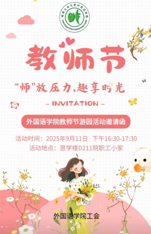 金秋送爽,桃李芬芳。在第41個教師節來臨之際,外國語學院于9月11日下午在院職工小家舉辦了以“‘師’放壓力,趣享時光”為主題的教師節游園活動。本次活動由外國語學院工會精心策劃,旨在為辛勤耕耘在教學、科研、管理服務一線的全體教職工送上節日祝福,讓平日辛勤的園丁們在歡聲笑語中舒緩身心、增進情誼。