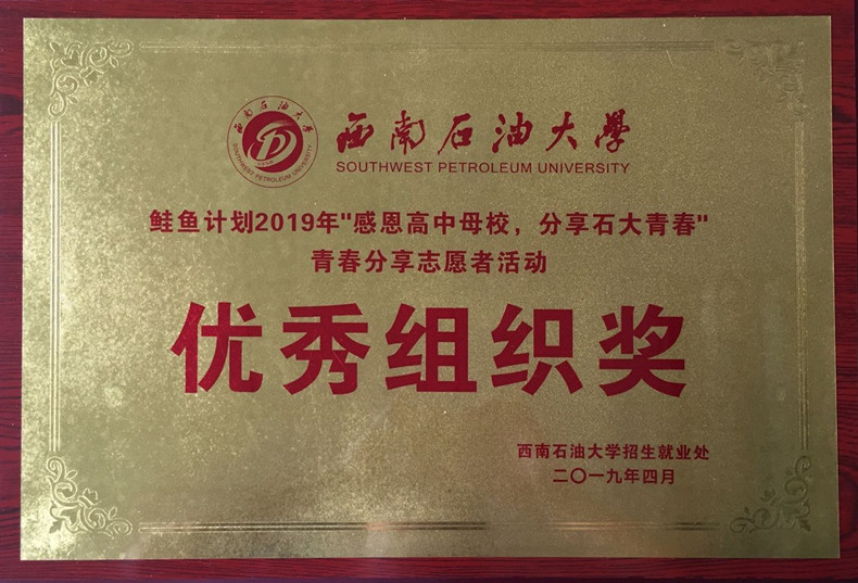 “感恩高中母校,分享石大青春”志愿者活動是我校招生宣傳的新方式,從2016年實施以來,一大批優秀學生回到高中母校,向師弟師妹分享成長故事和大學生活,宣傳西南石油大學的教育和科研成果,吸引了眾多考生招考我校。2019年寒假,學校開展了第四屆青春分享志愿者活動,我院組織了2018級和2017級學生參與了學校的青春分享活動,學生參與率、工作完成率均位于學校前列,我院被評為“感恩高中母校,分享石大青春”志愿者活動“優秀組織獎”,這也是我院從活動開展以來,連續第四次獲得“優秀組織獎”。