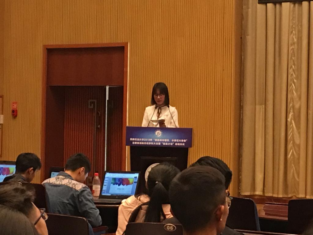 在“鮭魚計劃”啟動儀式結束后,進行了表彰和頒獎,我院榮獲“優秀組織獎”,夏蕾老師代表學院上臺領取了獎牌;我院2017級英語專業黃姝媛同學擔任隊長的“樂山一中小分隊”榮獲優秀團隊獎,黃姝媛作為優秀團隊代表做了現場分享報告;我院2017級英語專業王可馨同學獲得活動答辯一等獎和網絡人氣獎并作為獲獎代表上臺領獎。