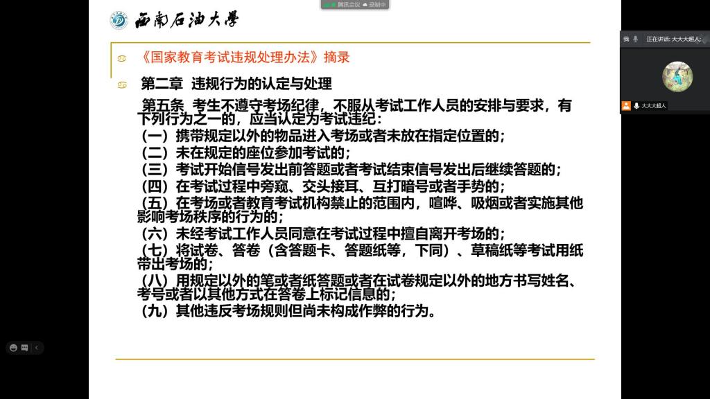 正值四六級考試、學校期末考試等來臨之際,各班全體同學集中學習《中華人民共和國刑法修正案(九)》涉考條款和《國家教育考試違規處理辦法》《普通高等學校招生違規行為處理暫行辦法》及《西南石油大學學生考試違紀、作弊處理辦法》等,以加強考試違規警示教育,并讓學生全面了解考試違規帶來的嚴重后果。