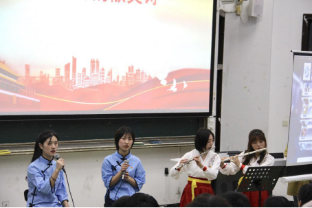 本次團會以新中國七十年歷史發展為主線,選取了“開國大典”“改革開放”“新時代”等重大事件和時間節點,向觀眾們展示了新中國成立以來的風風雨雨與取得的輝煌成就。一首《光榮啊,中國共青團》拉開了本次小精華團會的帷幕。在“開國大典”篇章中,演員們以話劇的形式,通過扮演學生、環衛工人、女商人等角色,再現了當時舉國同慶新中國成立的喜悅。通過一首《我愛你中國》,表演者以動聽婉轉的歌聲,寄托了對祖國大好河山的贊美,飽含著對祖國的赤誠熱愛。在“改革開放”篇章中,無論是吹唱結合的歌曲《父親寫的散文詩》,還是情感充沛的詩歌朗誦《改革的春天》,都展示了在無聲歲月中,人們迎來了美好的生活,新的生機開始在神州大地綻放。在“新時代”篇章中,幾位同學合唱了《北京歡迎你》,他們舉著國旗,臉上洋溢著笑容,仿佛回到了2008年那個讓人難以忘懷的時刻,展現了中國人的強烈自豪。慷慨激昂的演講體現了當代青年對理想的堅守和奮斗的力量,俄語歌曲《布谷鳥》揭示了戰爭的殘酷和反思。活動的最后,表演者們帶領合唱《我和我的祖國》,熟悉的旋律再次縈繞于耳畔。團會在合唱中圓滿結束。