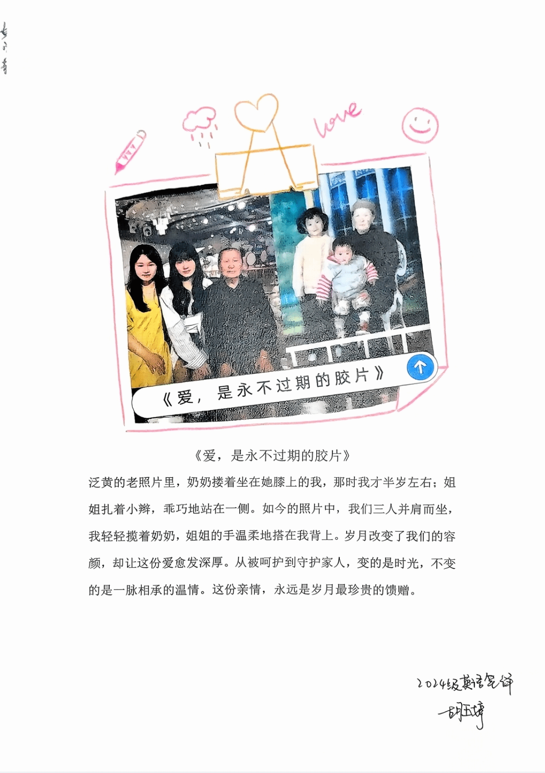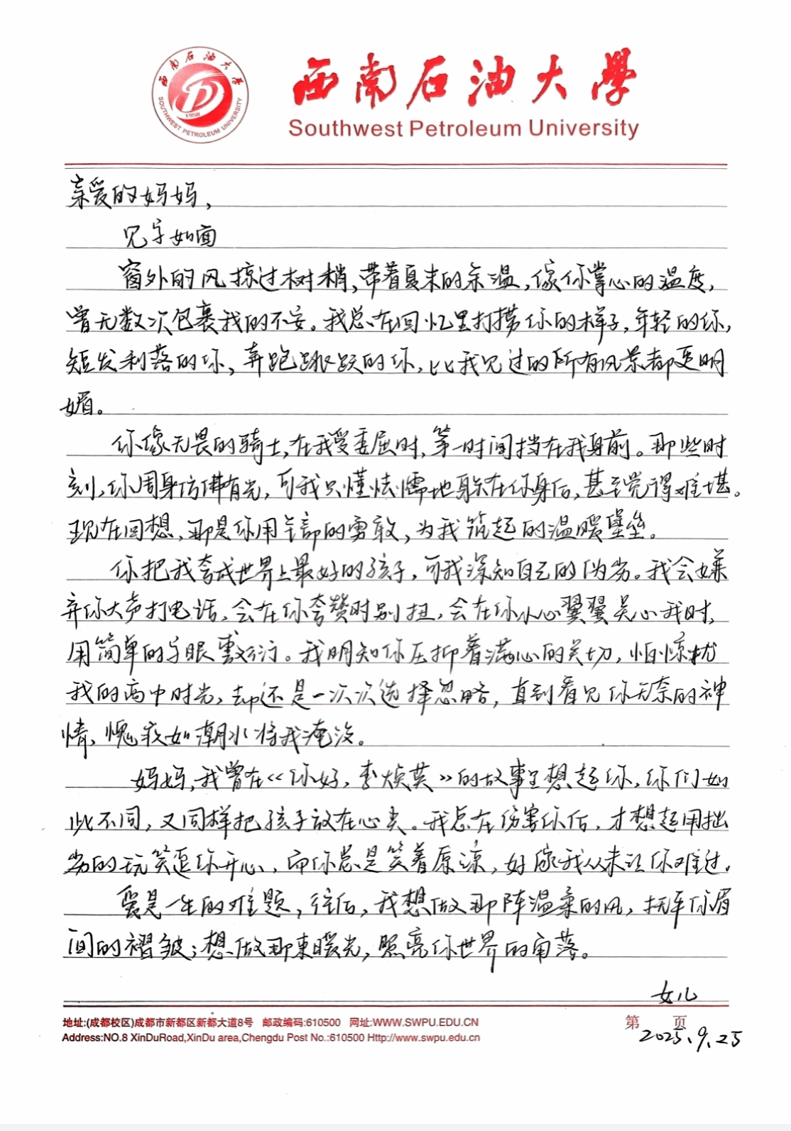 活動期間,同學們通過線上平臺踴躍投稿,以不同形式展現(xiàn)內心深處對家人的真摯情感。“相紙篇”收集了多組記錄家庭溫暖瞬間的老照片,每一張背后都是難忘的親情記憶;“畫筆篇”匯聚了同學們繪制的家庭生活場景,生動畫作傳遞出細膩的情感世界;“書信篇”則成為情感表達最集中的板塊,許多同學通過文字寫下平時難以開口的心里話。2025級劉同學在反饋中表示:“雖然不能面對面,但這次線上活動讓我靜下心來,認真寫了一封信給父母,仿佛完成了一次跨越千里的心靈對話。”