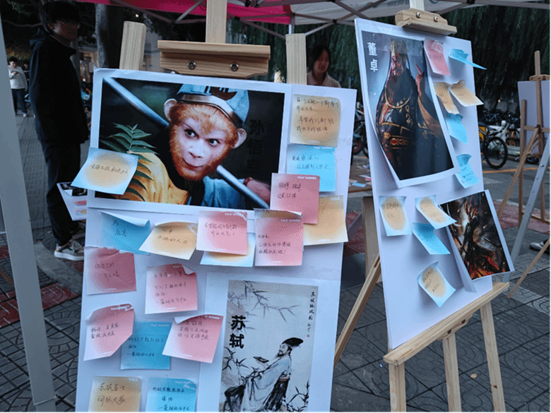 活動(dòng)現(xiàn)場(chǎng)放置貼有歷史人物、文學(xué)人物及作家圖片的板子,吸引著過(guò)路同學(xué)的目光。是蘇軾早年“左牽黃,右擎蒼”的豪情壯志,晚年“一蓑煙雨任平生”的豁達(dá);是林黛玉既有著“一朝春盡紅顏老,花落人亡兩不知”的傷凄,也有著“螯封嫩玉雙雙滿,殼凸紅脂塊塊香”的歡欣;更是史鐵生筆下地壇中的超脫生死,秋天懷念中的思念緬懷。從成就,生平,性格等方面不斷挖掘,展示了歷史人物、文學(xué)人物及作家的多面性。